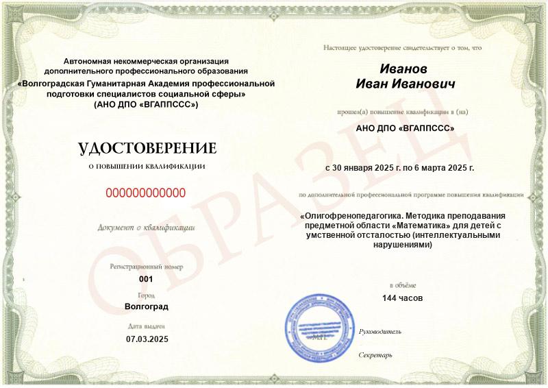 Олигофренопедагогика. Методика преподавания предметной области «Математика» для детей с умственной отсталостью (интеллектуальными нарушениями) в условиях реализации ФГОС (144ч)